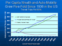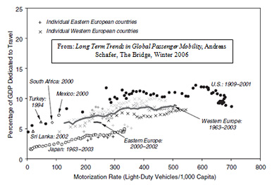 This behavior is not exclusive to the U.S. Indeed, this pattern is exhibited around the world. As per capita incomes rise there is a steady shift to an overwhelming preference for private automobile travel in nearly every country (with Hong Kong as a notable exception - largely due to geographical constraints). While public transit in major urban areas in Europe appears appealing to the tourist or urban core dweller, the reality is that the Europeans get around by car almost as much as North Americans.