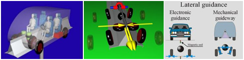 The RUF vehicles require two separate drive trains: one for the roadway where the exterior wheels bear the load and one for the guideway where a set of interior wheels carry the load on the flange of the monorail. In addition, perpendicular wheels that clamp each side of the vertical flange of the monorail provide traction and longitudinal control. Some illustrations of these mechanisms from the website are shown below.