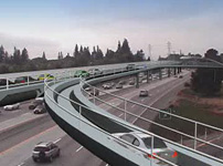 The QwikLane roadway is erected over the rights of way of existing freeways, roads and streets. By using standardized, prefabricated, 60 foot long road sections supported on pre-installed, standard columns, a simple mechanized erection process (setting each new section from previously laid sections) requires a fraction of the time and cost of normal freeway construction and does not disrupt traffic in the road below.